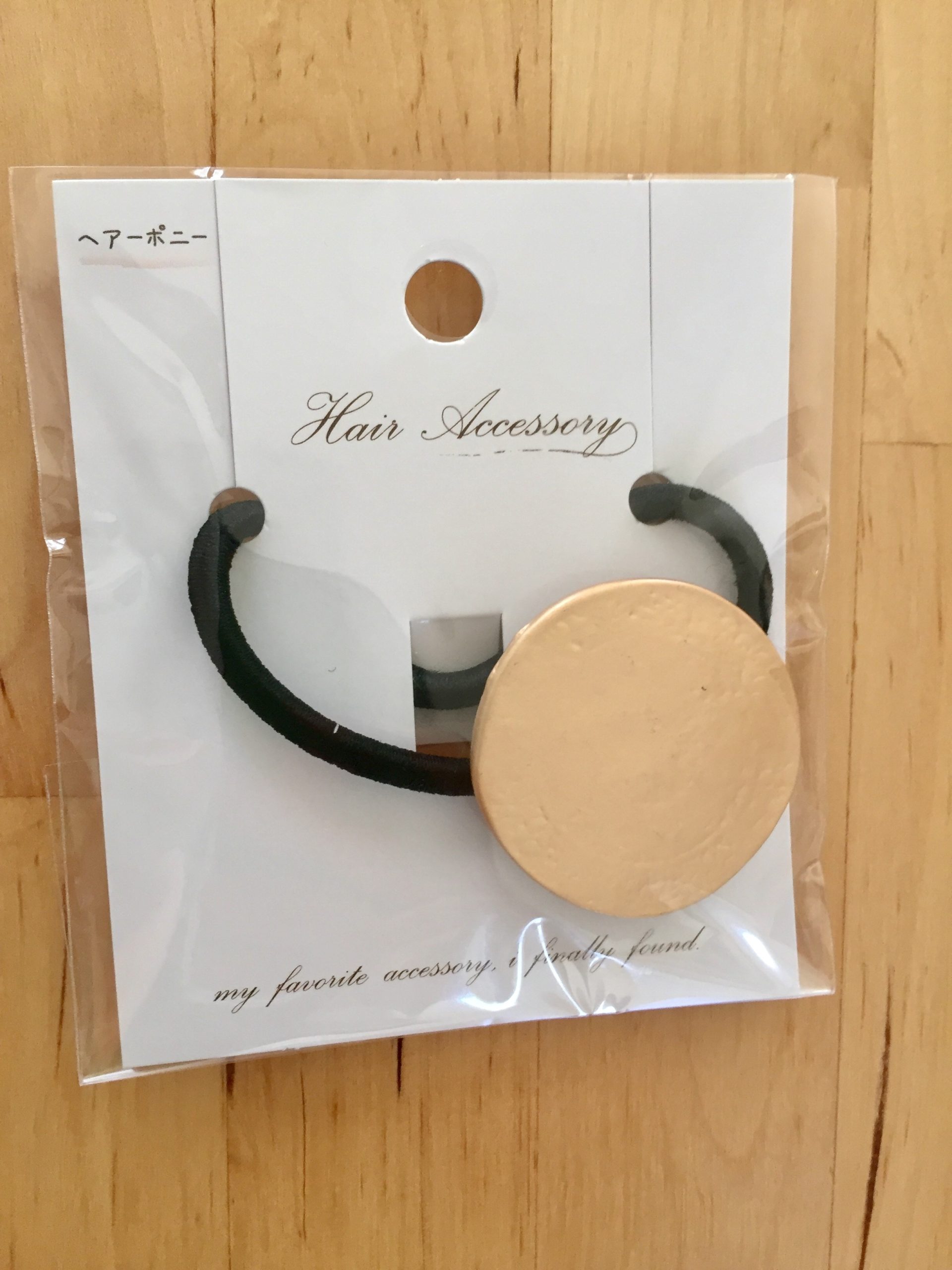 大きな丸いゴールドのメタルがついている髪ゴムとなっています。